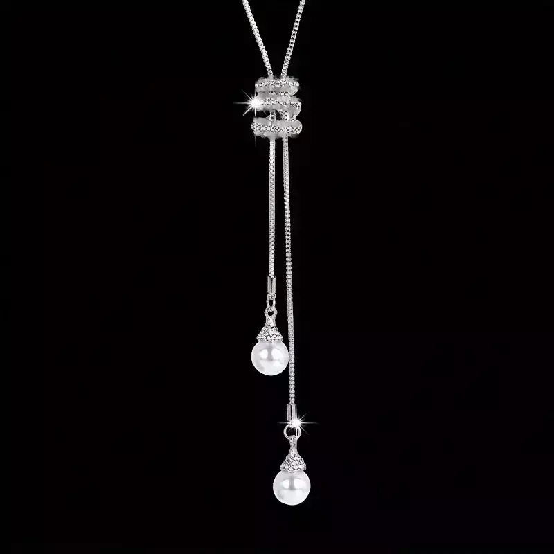 Colgante largo y sencillo de perlas con diamantes de imitación plateado